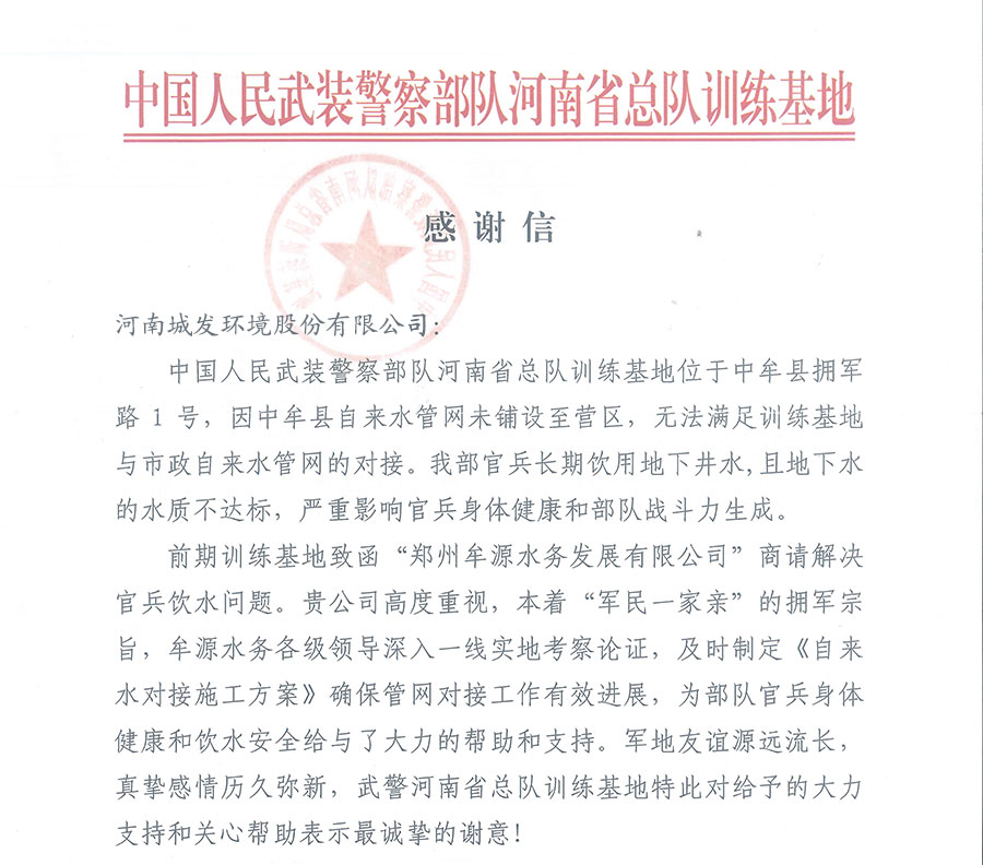 军地友谊源远流长,真挚感情历久弥新。7月28日,公司收到武警河南省总队训练基地的感谢信,对公司为了基地官兵身体健康和饮水安全给予的大力支持和关心帮助表示最诚挚的谢意!